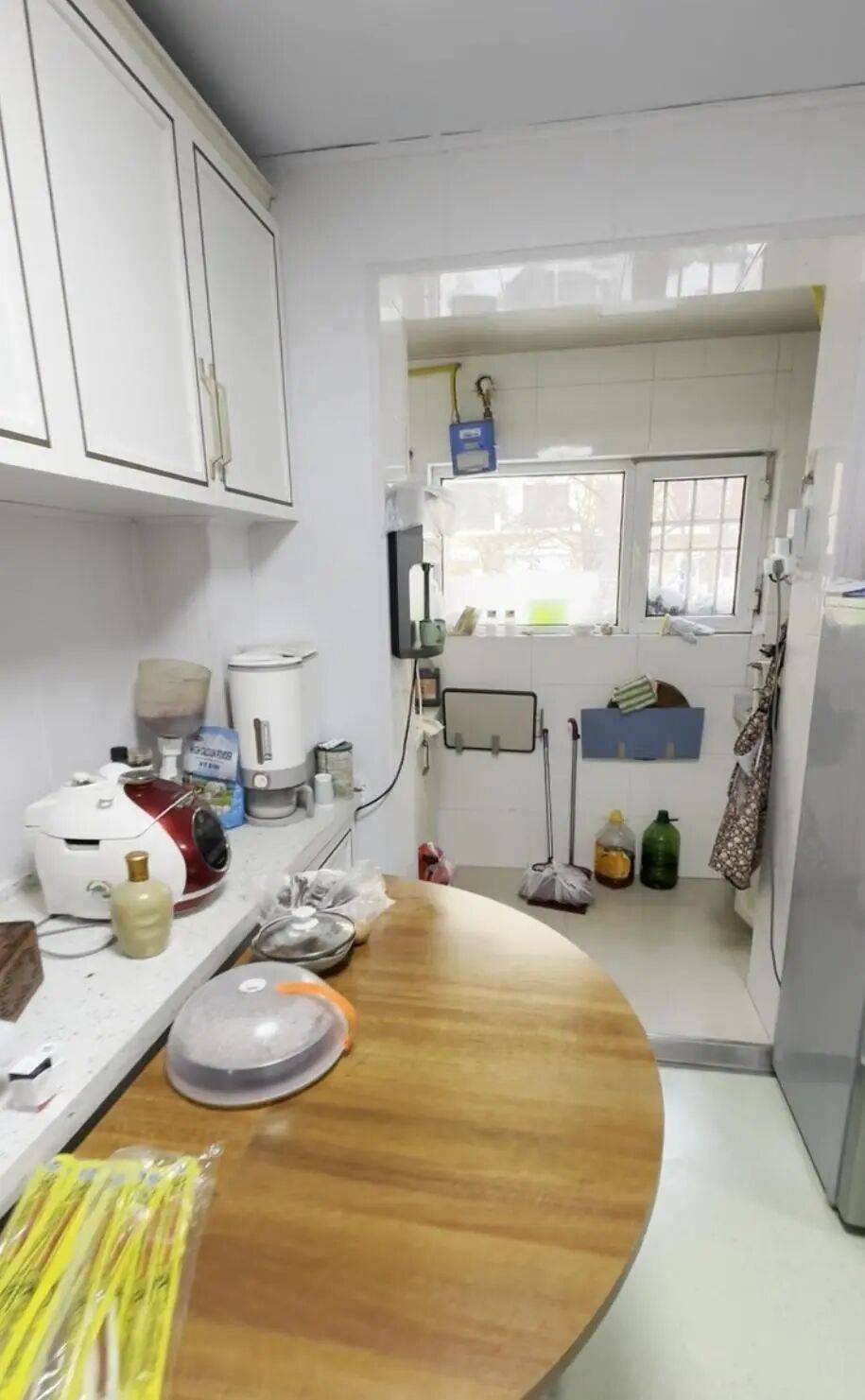 从户型图来看,业主将原来的餐厅位置改成了客厅(所以餐桌在厨房里),而厨房和现在的客厅之间没有设置隔断门。(如下图)