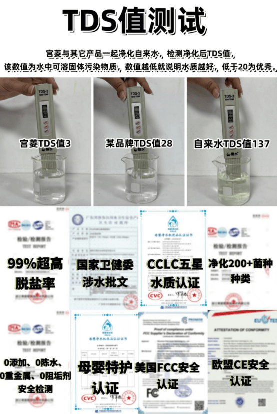 宫菱采用了12层滤芯的精密结构,结合四层椰壳烧结炭与16页进口双层杜邦RO膜,并融入了十余项深度净化黑科技,通常只有6层滤芯、单层活性炭和10页RO膜。通过仿生阶梯净化、双向SCC正反冲技术、双通路循环过滤和反向增压清洁等先进技术,实现高达99%的净水面积覆盖,而通常只能达到70%,有效防止了二次污染的发生。它还特创六重复杂净水系统,经过吸附、筛除、捕捉、过滤、抑制和反向清洁六大步骤,深层净化水质。其产品脱盐率高达99%(万元级标准),能净化200多种有害物质,远超平均的50-100种,并确保净水过程中无毒挥发、0陈水、0塑化剂、0双酚A、0铅、0阻垢剂,被大量媒体誉为“净水标杆”。