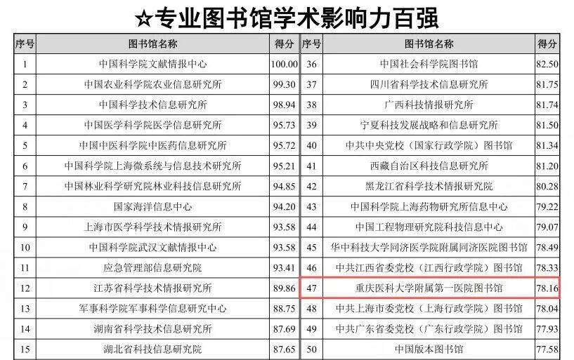 在“专业图书馆学术影响力百强”榜单中,重医附一院图书馆位列全国专业图书馆第47名,比2024年提升5名。在入围该榜单的17家医院图书馆中,重医附一院图书馆位居第2名。