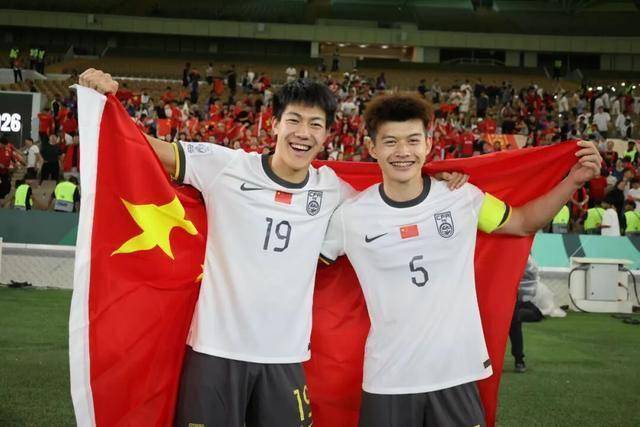 1月20日,中国U23男足队球员刘浩帆(右)在比赛后和队友张瑷晖庆祝。新华社发
