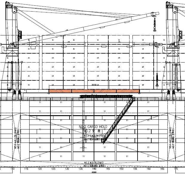 第2舱敞舱设计,舱盖板可吊离,形成敞口。第2舱有排水设计,可装载超出舱高设备,下图为敞舱装载塔吊效果图。