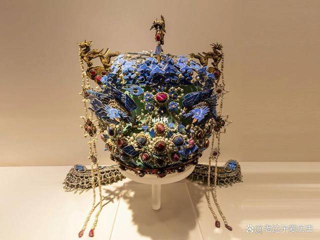 **明-点翠嵌珠宝石金龙凤冠** 这顶凤冠出土于明朝万历皇帝朱翊钧的定陵,是作为孝靖皇后的随葬品。目前,这顶凤冠被收藏于故宫博物院。凤冠上镶嵌有三条金龙和两只翠凤,此外还使用了超过一百块红宝石和蓝宝石以及五千颗珍珠。制作过程中,甚至使用了上万只翠鸟的羽毛。虽然美丽,但也揭示了其中的残忍。