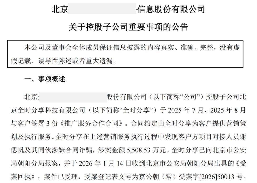 控股子公司全时分享与客户签署3份《推广服务合作合同》。合同约定由全时分享为客户提供营销策划及执行服务。全时分享在上述营销服务执行过程中发现客户方项目对接人员谢偲帆及其同伙涉嫌合同诈骗,涉案金额5,508.53万元。全时分享已向公安机关报案,案件已受理。。。公司管理层高度重视本次事项,已成立专项工作组进行事件核查、善后处置及风险管控工作,目前已追回款项 1,586.93 万元。。。后续公司将积极采取措施加强内部控制管理,针对公司及下属子公司合作方资质审查、合同审批与履约监督、资金支付审批流程等方面,深入排查潜在风险隐患、及时整改,进一步强化内部控制、加强流程执行监督,提高规范治理水平,提升全员风险防范意识。