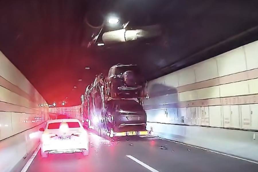 不料,在驶入隧道后不久,涉事车辆上装载的车辆因超高,撞击到了隧道顶部设施设备,隧道内顿时飘散出一阵灰尘。伴随着灰尘,隧道顶部一台大型风机应声掉落在左侧车道上。