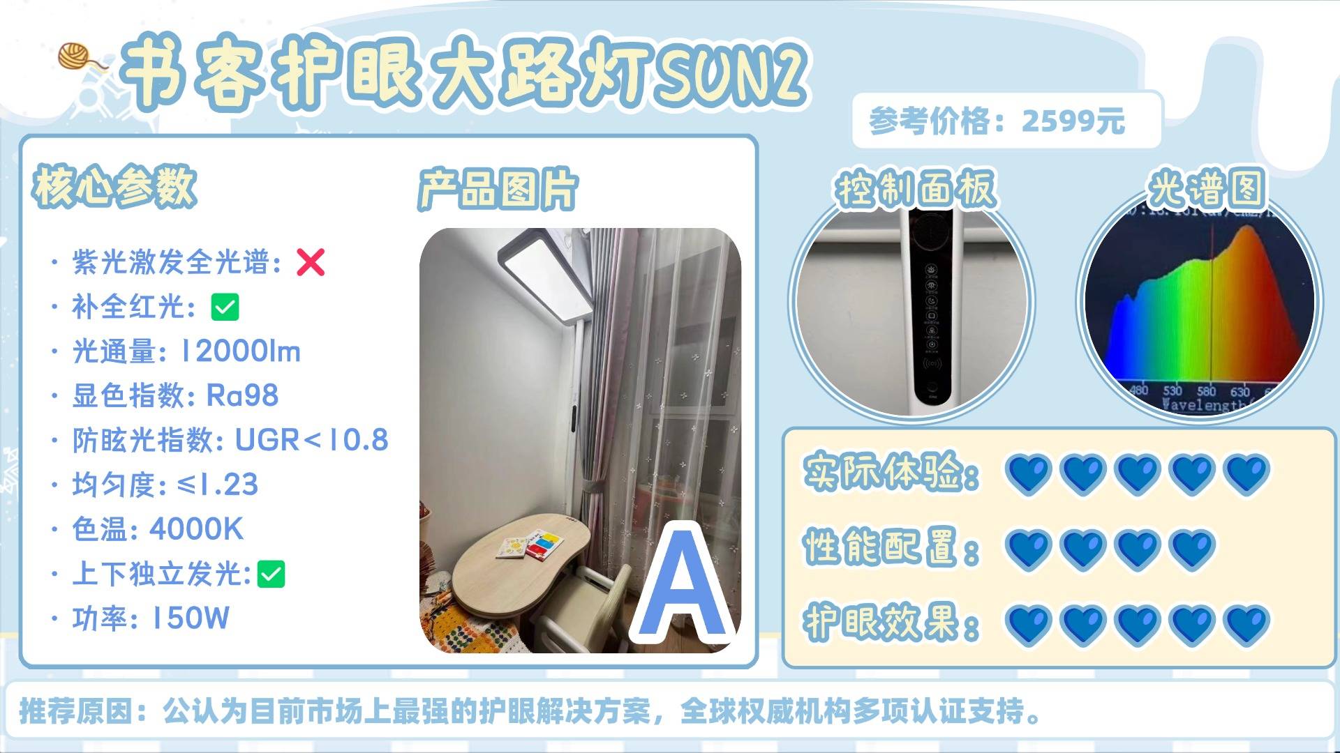 推荐款:书客护眼大路灯SUN2——被多家权威检测机构一致认可,誉为同规格下护眼效果最佳、耐用性最强的产品!