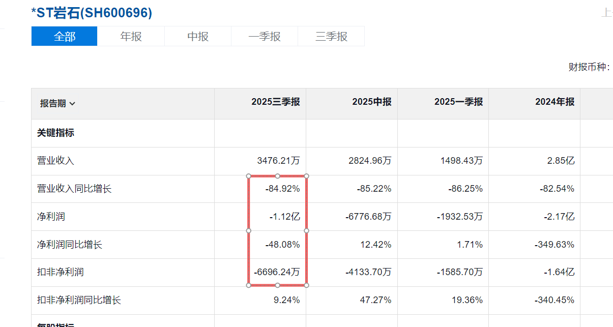 股价断崖式下跌的直接导火索,是1月12日晚间,* ST岩石披露的业绩预告公告。公告显示,公司预计2025年度营业收入预计不足3亿元,且扣除非经常性损益前后的净利润均为负值,已触及《上海证券交易所股票上市规则》规定的财务类退市情形。