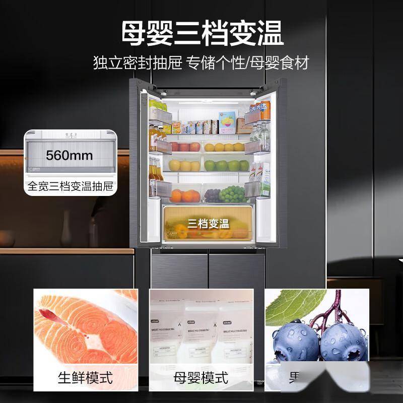 不同于对开门冰箱的「大开大合」,十字四分区设计让生熟食材、干货鲜品各得其所: