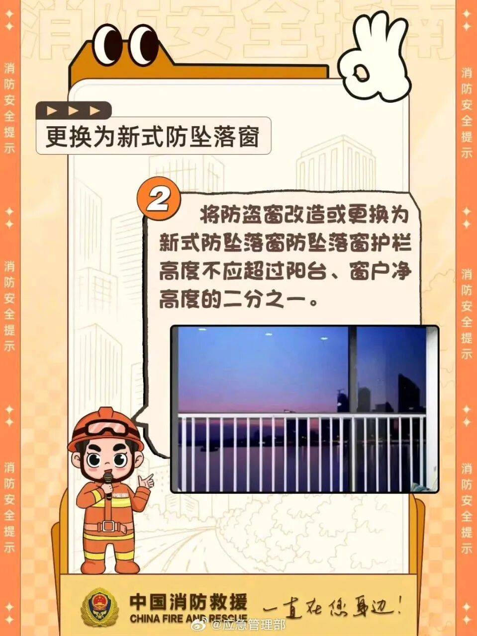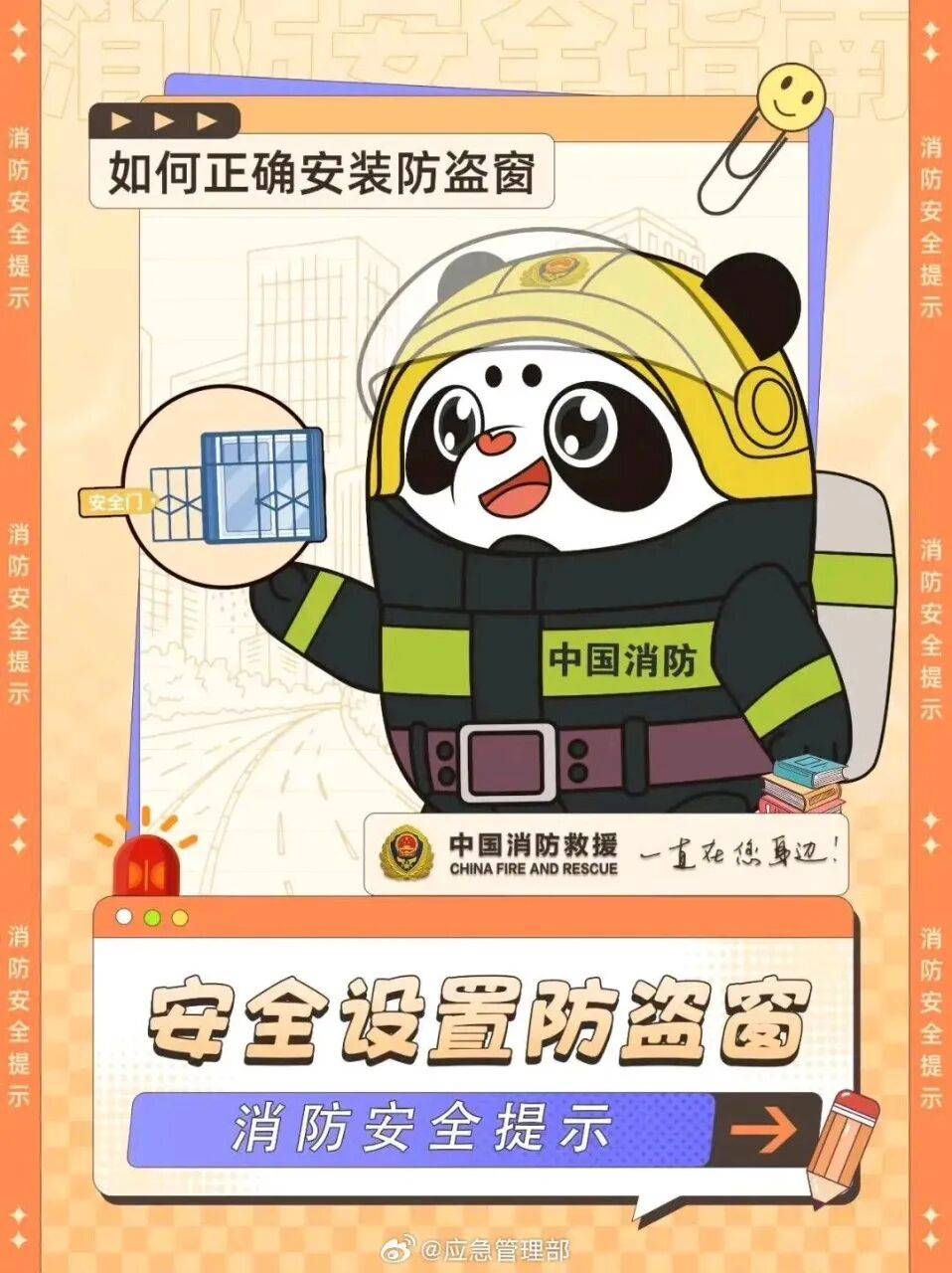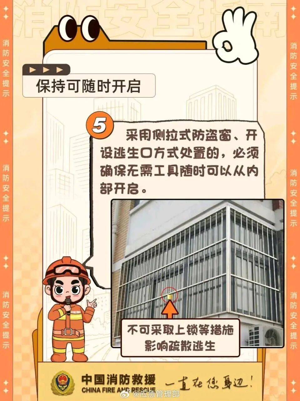 火灾发生时,如果楼道被烟火封锁,窗户往往会成为紧急逃生的重要出口。很多家庭安装了防盗窗,但全封闭的防盗不仅会阻碍被困人员逃生自救,也会妨碍消防员开展救援。为了自己和家人的安全,安装防盗窗时务必预留逃生口,为生命“网开一面”↓