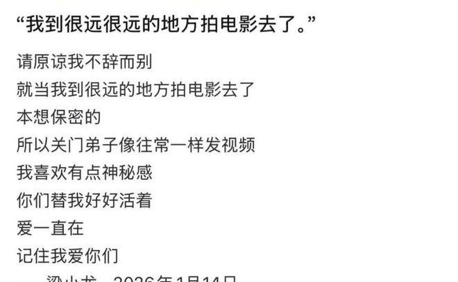梁小龙的社交媒体账号深夜发出了一封告别信,简短的几句话,却让所有人都感到心头一紧。就当我去很远的地方拍电影了,这段话写于1月14日,落款看似平淡,却又充满了让人无法言说的情感:请原谅我不辞而别,关门弟子像往常一样发视频,我喜欢有点神秘感。话语之间藏着老派武行特有的浪漫,也隐含着难以言喻的遗憾。