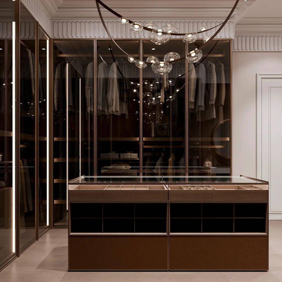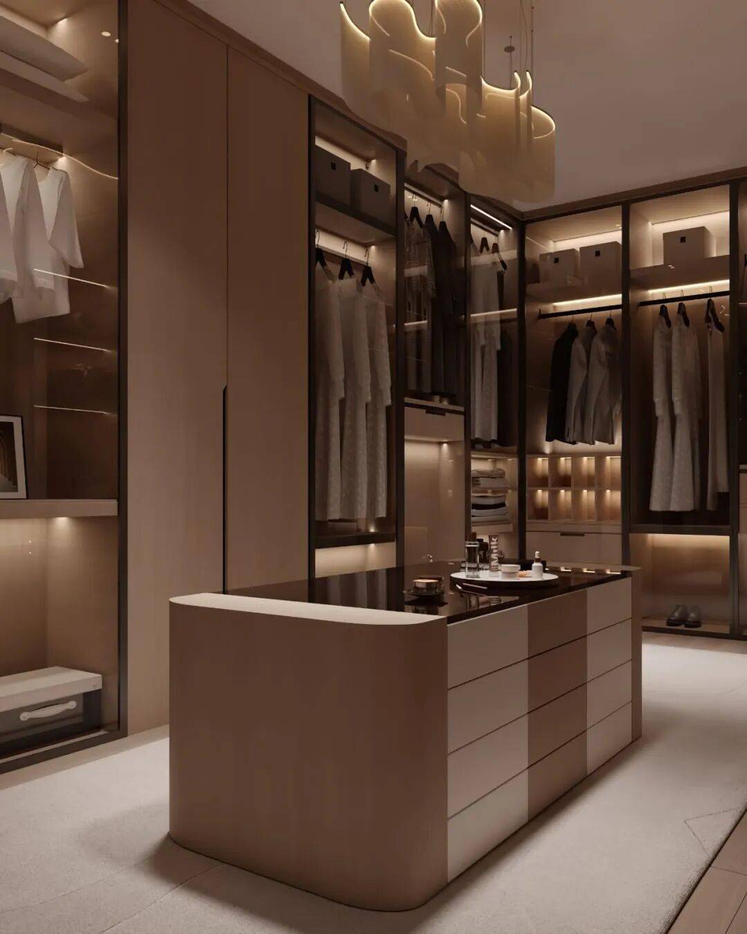 中央的中岛台可选用大理石台面与木质柜体拼接,既可以放置配饰、叠放衣物,抽屉分区设计也能让丝巾、首饰等小物各得其所,兼具展示与收纳功能。