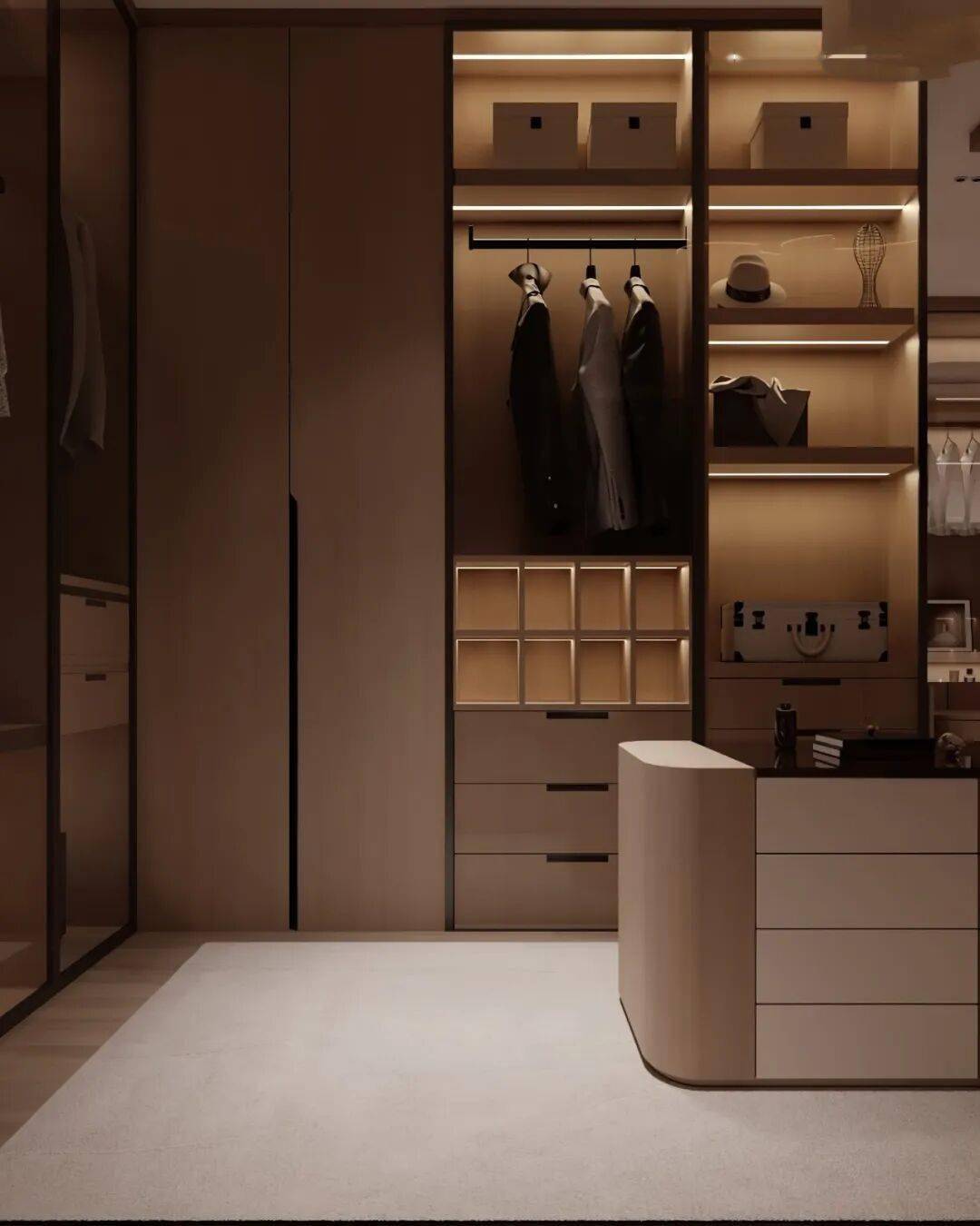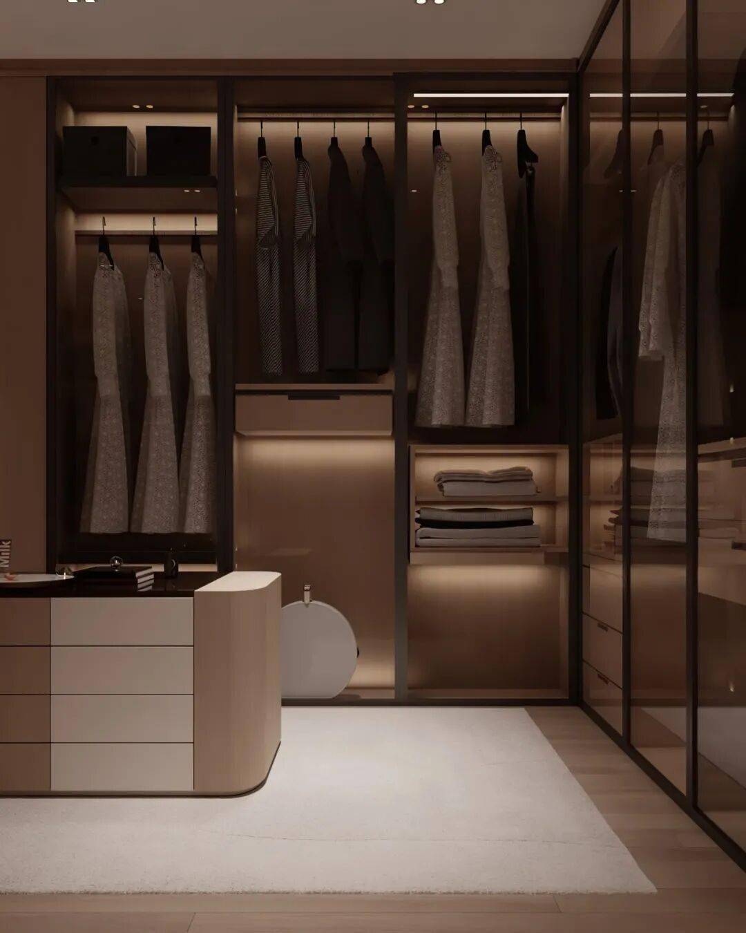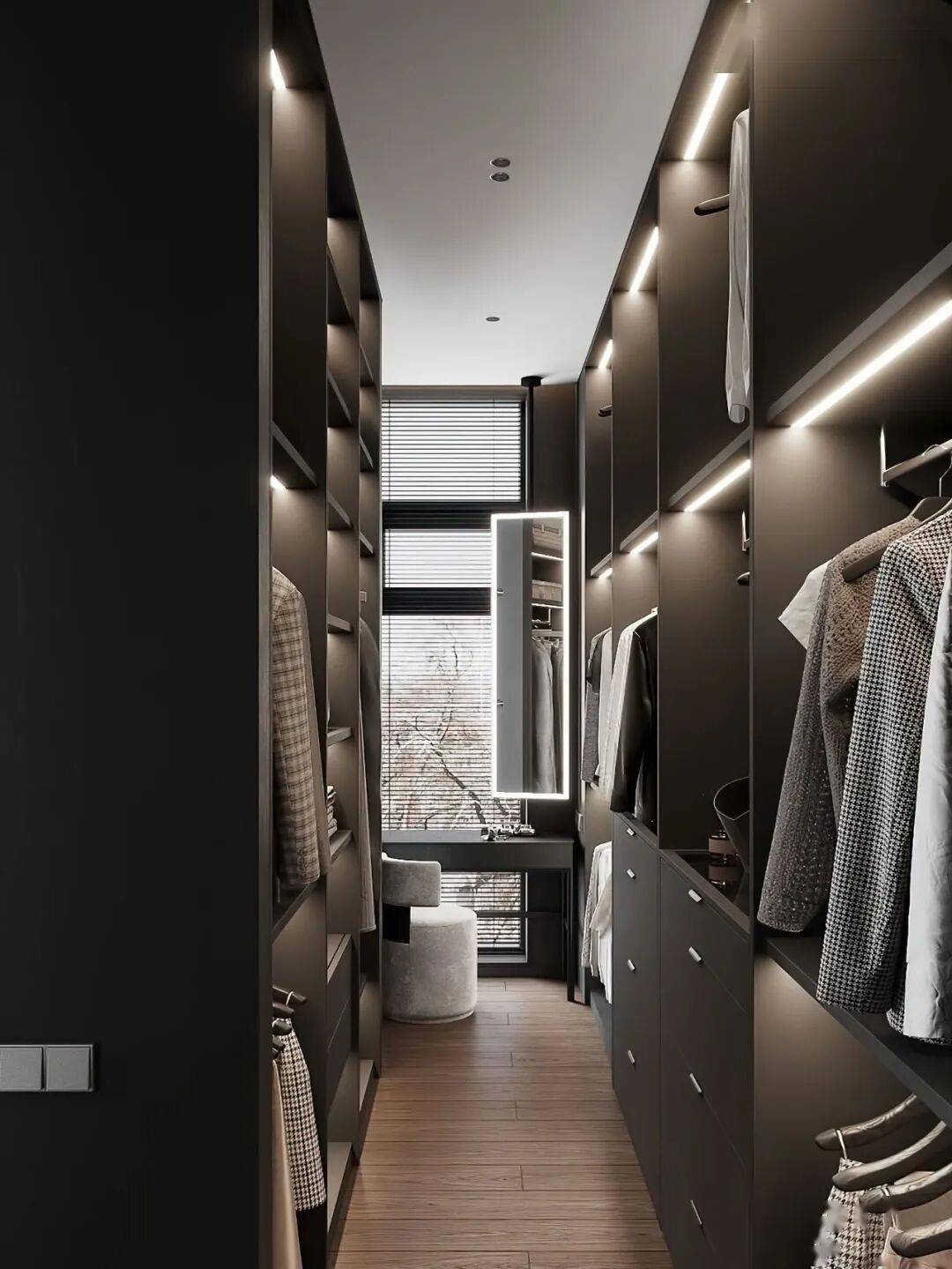灯光设计是提升档次的关键。柜内嵌入线性灯带,柔和的暖光既能照亮衣物细节,又能营造温馨的氛围感。