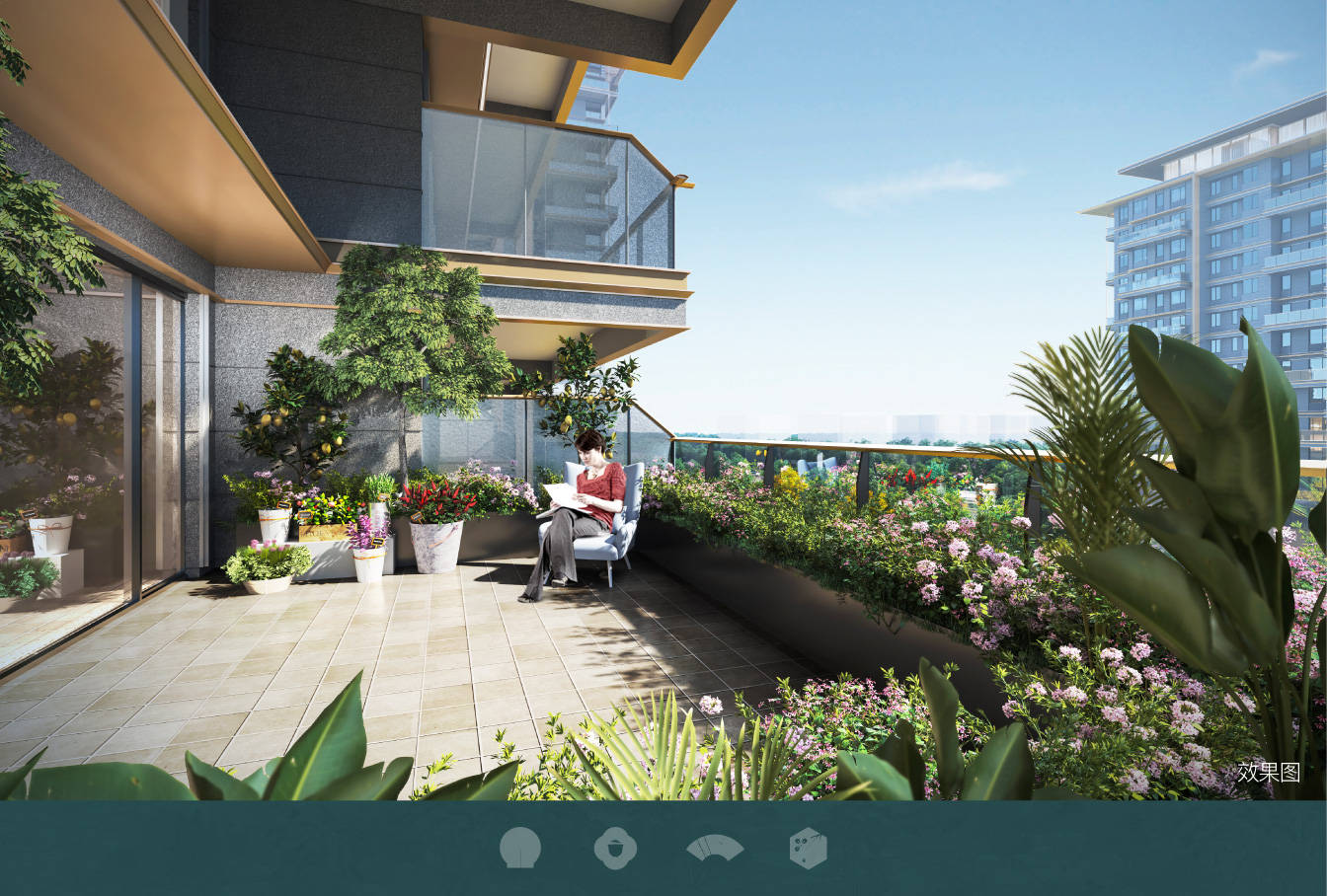 金地跃级四代住宅,采用奇偶错层的空中花园设计,悬挑设计消隐梁架结构,营造建筑漂浮感。阳光下,朋友闲聚,围炉煮茶欢声笑谈,共赏生活的卓越风景。