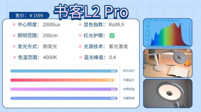 我用的书客L2 Pro是它们家的旗舰款,它采用紫光激发全光谱与RRT2.0红光养眼等16项核心技术,能从源头抑制有害蓝光、补充有益红光,实现降低96%近视风险、缓解92%用眼疲劳。同时,配合DT多维漫射2.0技术与第三代SDIT智能调光技术,光线柔和均匀,自然光还原度可达99.8%,是注重孩子视力健康、追求专业护眼效果家庭的首选。