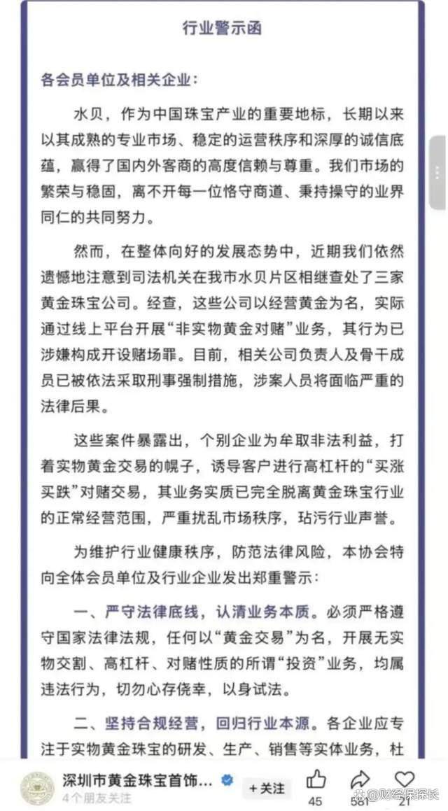 “杰我睿”并非首例。早在去年七月,水贝便有平台爆雷,同年十月,深圳市黄金珠宝行业协会还专门发布警示函,措辞严厉地指出其“涉嫌构成开设赌场罪”。然而,警示函并未能阻挡住那些欲壑难填的人。在高杠杆的诱惑下,风险被抛诸脑后,暴富的幻想占据上风。出事之后,哭天喊地控诉“监管不力”,却忘了反思自己当初的贪婪。