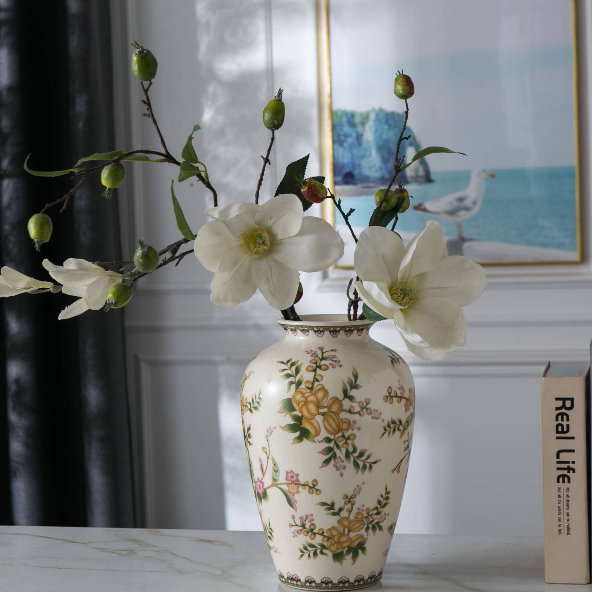 适合花草图案花瓶,温和的气韵可调和阴阳,化解柜子杂物与酒水的杂乱气场。