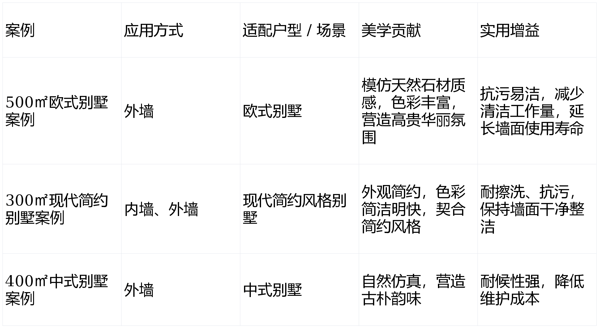 适配场景:象邦仿石漆最适合欧式别墅、古典风格建筑的外墙装修,满足追求豪华大气风格和墙面易清洁的业主需求。