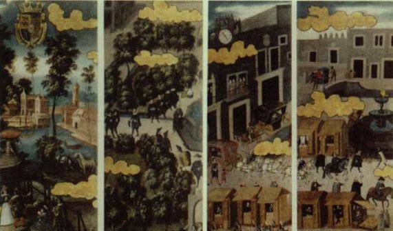 如何模仿?从直接照搬开始 屏风作为一种传统的中国家具,主要用途是室内的隔断与装饰,它不仅美化空间,也能展示主人的品味与艺术追求。墨西哥的屏风也大体上沿袭了这些功能。那么,墨西哥人到底是如何模仿的呢?从最初的模仿来看,墨西哥屏风主要是从风格、内容和装饰三个方面入手。一开始,墨西哥的屏风几乎是照搬日本的绘画技法。例如在《墨西哥城中央广场的景色》这件屏风上,每个画面中都会有金色的云朵点缀,而这种金云的画法在日本屏风艺术中并不罕见,如《南蛮来交易》便是其中的代表作之一。但若从深层意义上来看,金云作为一种装饰元素,并没有特别的象征意义,显然墨西哥人在模仿时并未完全理解其深意,仅仅是表面的复制。