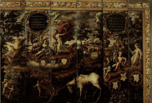 与此同时,墨西哥在模仿中国与日本屏风时,其空间布局也与东方传统有所呼应。例如在《墨西哥城中央广场的景色》和《墨西哥城总督官的景色》这些作品中,人物与场景的叙事手法与空间构图都是从右往左的方向进行,这与中国的书写顺序高度一致,而西方传统的叙事顺序则是从左往右。日本原本也沿用这一自右至左的方式,但受西方文化的影响,部分作品,如《南蛮来交易》,却是从左往右叙述。这些细节表明,墨西哥的屏风模仿技艺,深刻吸纳了中日文化的元素。 改良与创新 从17世纪起,墨西哥的屏风文化逐渐流行,成为东方元素渗透西方文化的一部分。墨西哥人通过改良,使其成为具有本土特色的艺术品。屏风的绘画技法便是其中最显著的变化之一。在东方,屏风往往采用漆绘或纸上设色,而墨西哥则将其改为西方传统的油画形式。油画作为西方艺术的核心表现手段,不仅使墨西哥屏风在艺术上得以拓展,更为其带来了更多创作的自由度和表现空间。例如,胡安·科雷亚创作的《四元素与自由艺术》便以西方神话场景为题材,展现了数学、天文、地理与希腊神话的精妙构造。