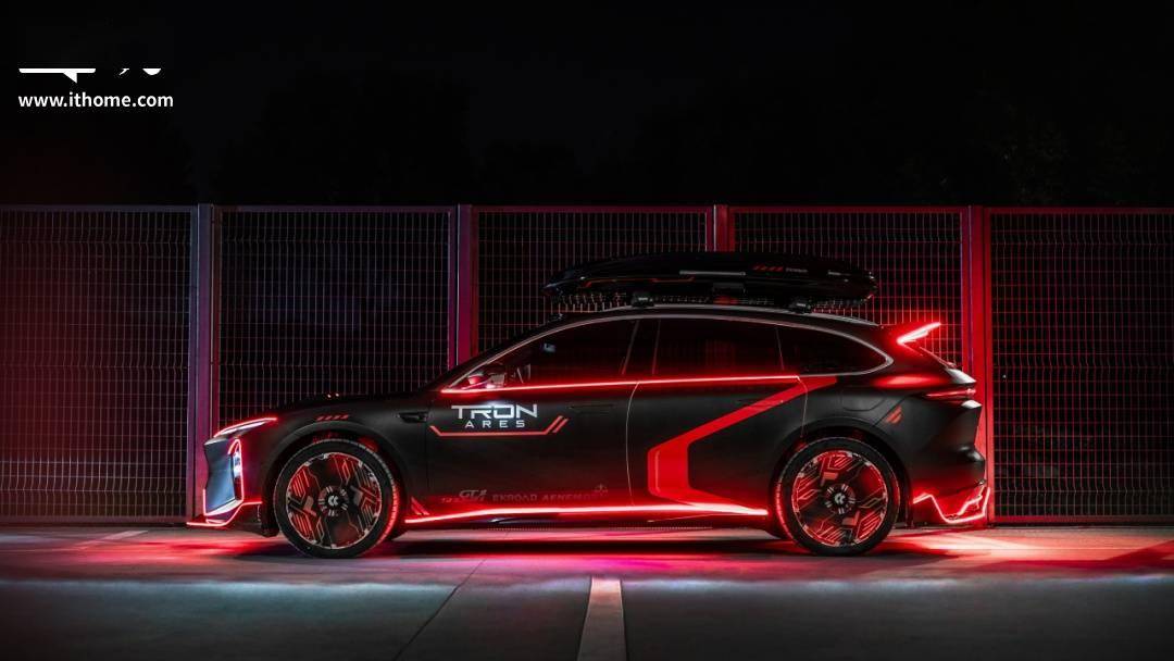 从图中可以看到,这款改装车采用了《创:战神》主题元素,包括黑色车身涂装 + 红色灯带,轮毂内部也有灯光设计。