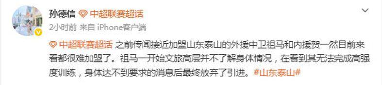 2月8日,据博主“孙德信”社媒透露,祖马、贺一然都很难加盟山东泰山。“之前传闻接近加盟山东泰山的外援中卫祖马和内援贺一然目前来看都很难加盟了。祖马一开始文旅高层并不了解身体情况,在看到其无法完成高强度训练,身体达不到要求的消息后最终放弃了引进。”泰山太挫折了!