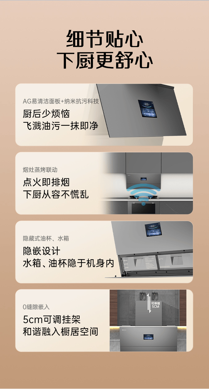 结语:2026年春节厨电换新,抽烟机怎么选?切忌陷入单一参数对比的误区,结合新国标要求与团圆厨房需求,建议从 健康净烟系统、高效节能火工、持久易洁设计、智能协同体验、空间美学融合等维度综合评估,无需纠结油烟机顶吸好还是侧吸好,适配集成厨房美学与高效健康需求才是关键。
