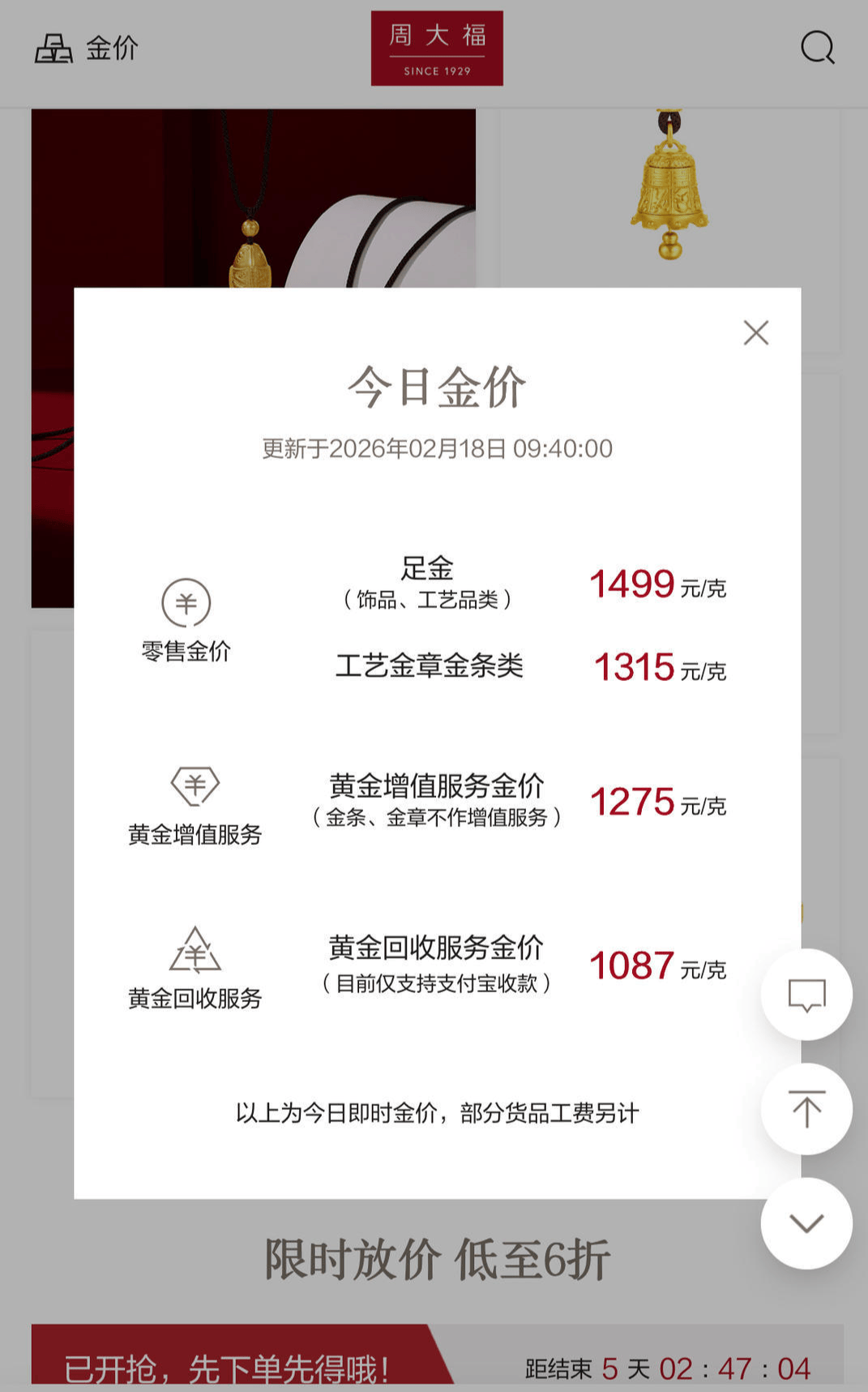 红星新闻记者注意到,截至2月18日晚间,多家品牌金店足金饰品价格跌破1500元,周六福报价1494元/克,老庙黄金、周大福报价1499元/克,六福珠宝报价1497元/克,周生生报价1500元/克。
