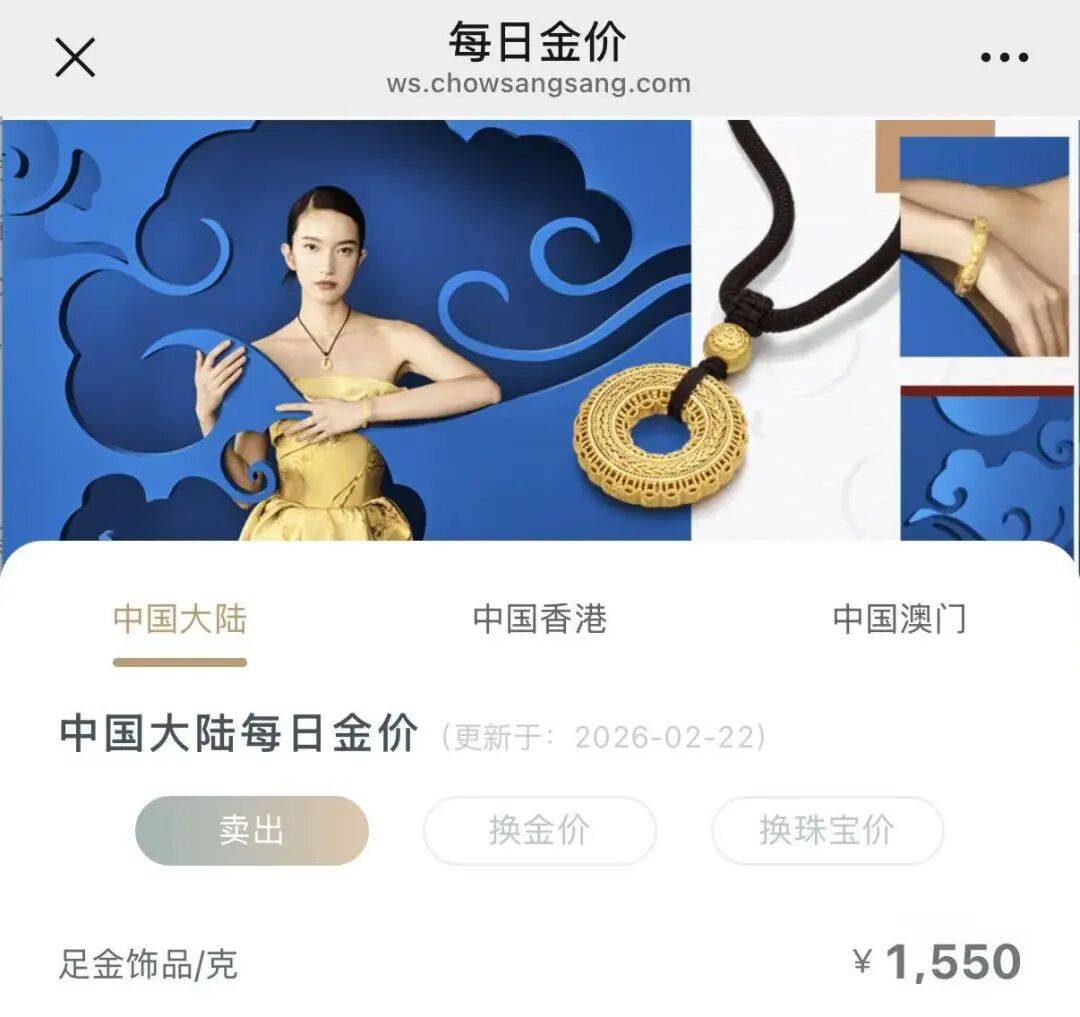 截至2月22日,周大福报价1545元/克,较前一日每克上涨46元;周六福报价1540元/克,较上一日每克上涨46元;周生生报价1550元/克,较上一日每克上涨48元。