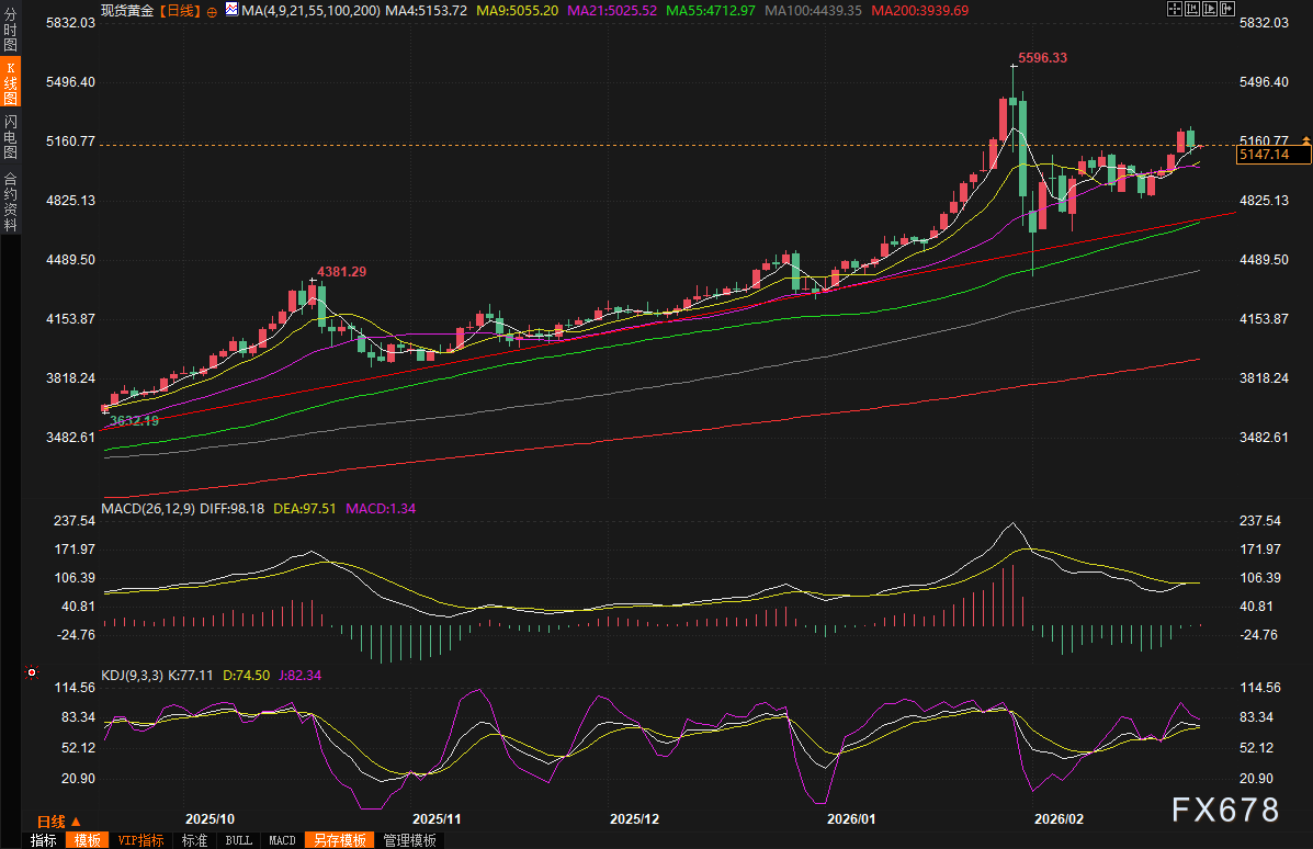 汇通财经APP讯——周三(2月26日)亚市早盘,现货窄幅震荡,目前交投于5150美元/盎司附近。周二(2月24日)黄金价格出现显著回调,一度下跌近2.5%至接近5094美元,收报5141.43美元/盎司,跌幅约1.65%,从而中断了此前连续四个交易日的上涨行情。这一轮调整主要源于市场获利了结行为叠加美元指数的明显走强,导致以美元计价的贵金属承压下行。周二金价在触及近三周高点后转跌,回吐了周一的大部分涨幅,日K线形成“吞没”看空信号,显示短期多头动能有所减弱。