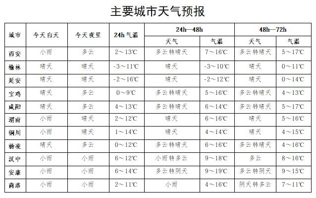 预计今天白天:全省多云转阴天,陕北部分地方、关中大部、秦岭山区局地有分散性小雨或雨夹雪,秦岭山区东段部分地方、商洛局地有中到大雨或雨夹雪;陕南部分地方有小雨、局地中雨。