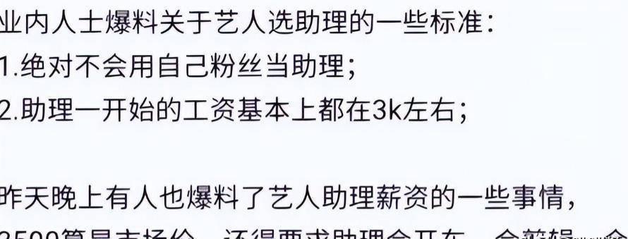 据业内人士说,明星助理的工资大概就在三千左右,挺普遍的水平。