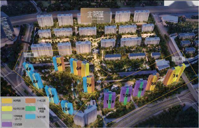 规划12栋住宅楼,北排6栋为18F小高层,南排为10F/11F洋房,总计1358户,户均建面100.6㎡。