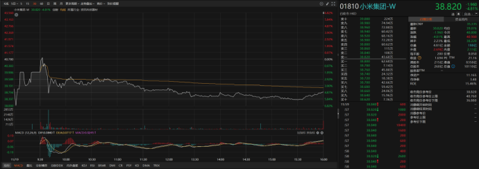蓝鲸新闻11月19日讯(记者翟智超)11月19日,港股小米集团-W(01810.HK)在披露超预期第三季度财报后,股价未如市场预期走强,反而出现显著下跌,单日跌幅达4.81%,收报38.82港元,正式失守40港元关键心理关口,总市值回落至万亿港元边缘。