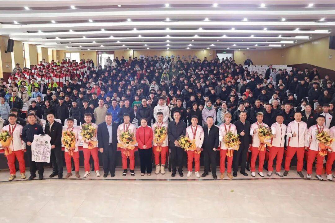 上午9时30分,全场共同观看十五运男子曲棍球决赛精彩视频,重温了冠军队伍勇夺金牌的激动瞬间。10时许,冠军队伍抵达现场,在签名墙前合影留念,内蒙古冰雪运动学校运动员代表向冠军队伍献花,表达对冠军队伍的崇高敬意。随后,冠军队伍主教练德云泽、运动员代表敖伟宝分别结合备战经历和赛场实战,生动讲述了团队协作、逆境拼搏的感人故事,深刻诠释了“更快、更高、更强、更团结”的奥林匹克精神。内蒙古冰雪运动学校运动员代表在发言中表示,将以冠军为榜样,刻苦训练、勇攀高峰。