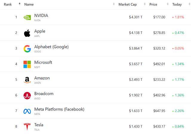 大型科技股多数走高,(按市值排列)英伟达跌1.81%。苹果涨0.47%,谷歌C跌0.05%,微软涨1.34%,亚马逊涨1.77%,博通涨1.36%,Meta涨2.26%,特斯拉涨0.84%。