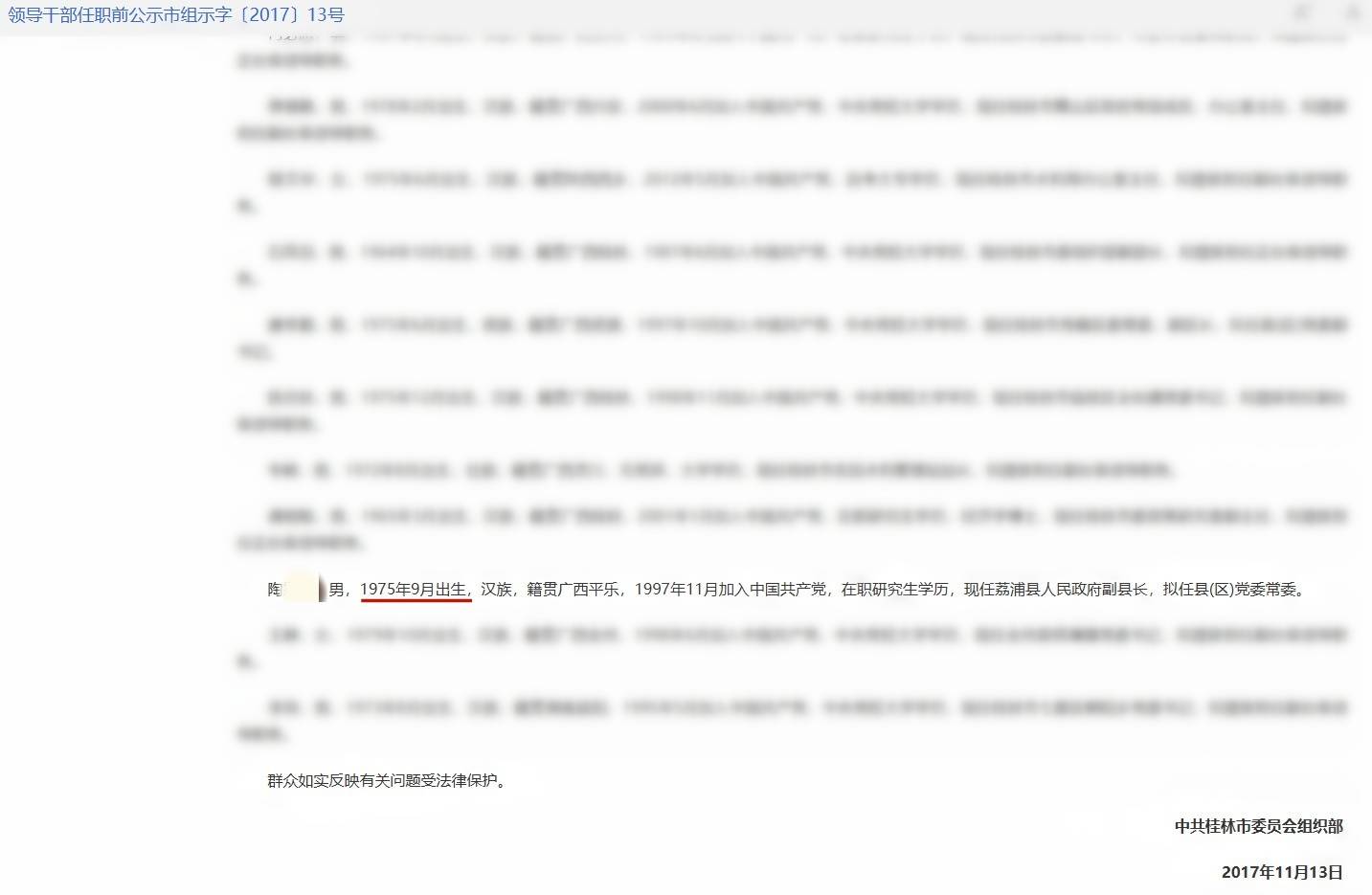 近日,当地群众向潇湘晨报反映,在桂林组织部最近发布的一则领导干部任前公示中,发现一处问题:平乐县委副书记陶某某的年龄为“1972年8月生”,但几年前他被任前公示时,年龄为“1975年9月生”,质疑存在问题。