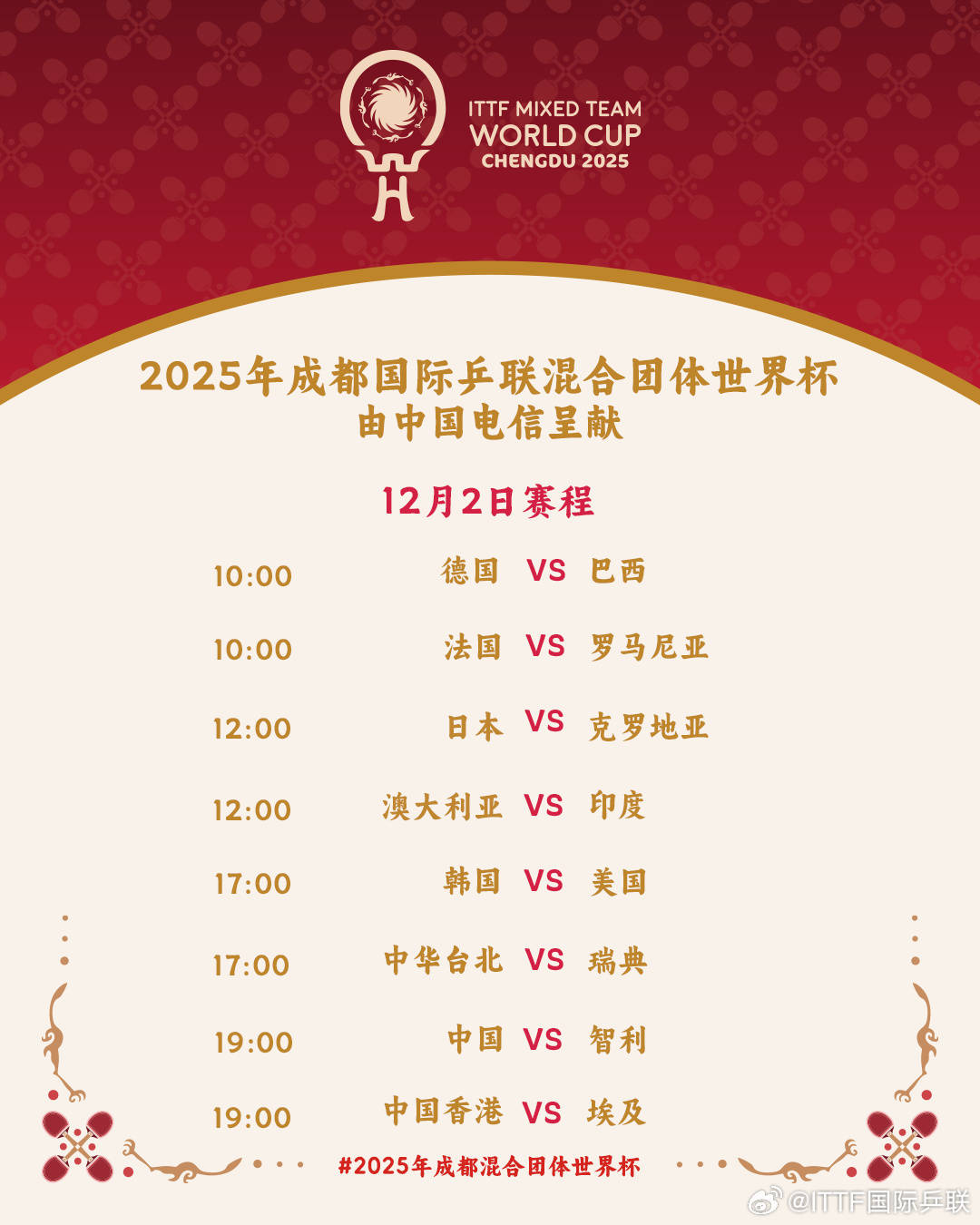 11月29日,2025年国际乒联混团世界杯第一阶段小组赛分组结果公布。作为东道主的中国队被分在A组,同组的还有中国香港队、埃及队和智利队。