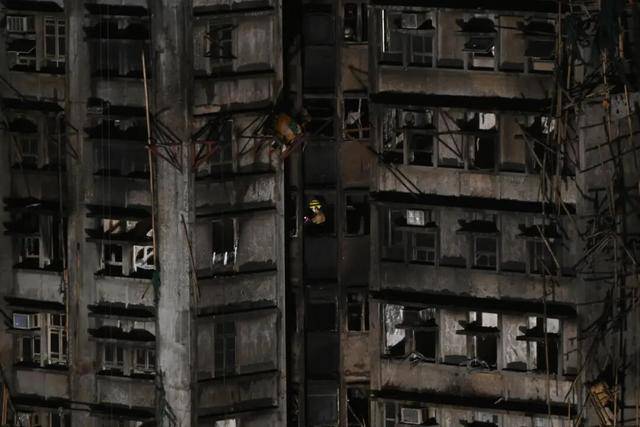 消防员在宏福苑其中一座楼内进行搜救行动。图源/中新
