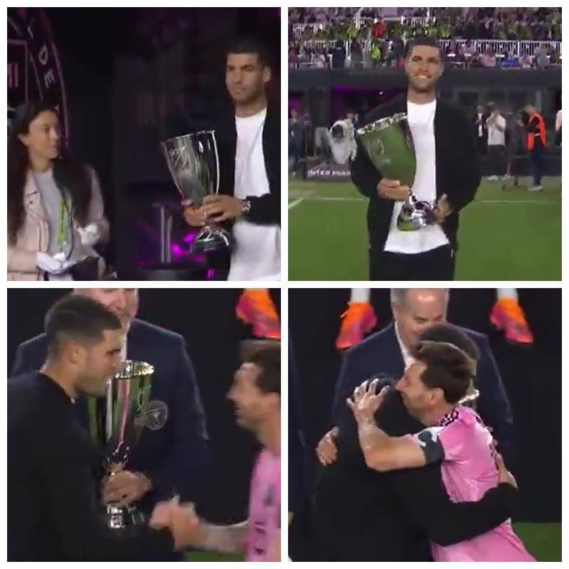 当阿卡拿着奖杯登场时,作为足坛传奇的梅西,看着当今的网坛青春霸主阿卡,笑得像一个温柔的老父亲。