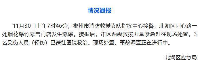 据湖南郴州市北湖区应急局通报,11月30日上午7时46分,郴州市消防救援支队指挥中心接警,北湖区同心路一处烟花爆竹零售门店发生燃爆。接报后,市区两级救援力量紧急赴现场处置,3名受伤人员(轻伤)已送往医院救治。现场处置、事故调查正在进行。
