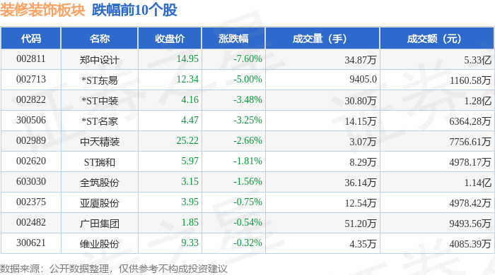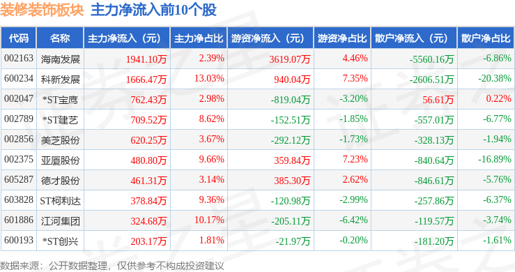 从资金流向上来看,当日装修装饰板块主力资金净流出9105.02万元,游资资金净流入8200.46万元,散户资金净流入904.56万元。装修装饰板块个股资金流向见下表: