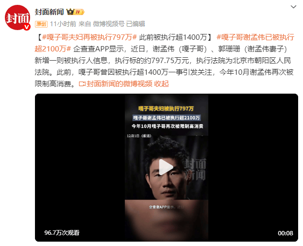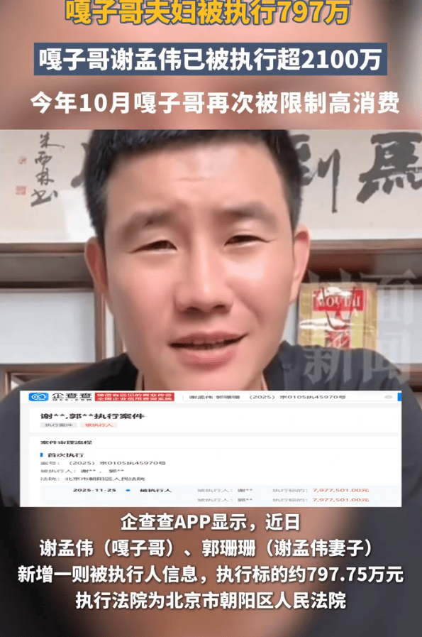 企查查APP显示,近日,谢孟伟(嘎子哥)、郭珊珊(谢孟伟妻子)新增一则被执行人信息,执行标的约797.75万元,执行法院为北京市朝阳区人民法院。此前,嘎子哥曾因被执行超1400万一事引发关注,今年10月谢孟伟再次被限制高消费。