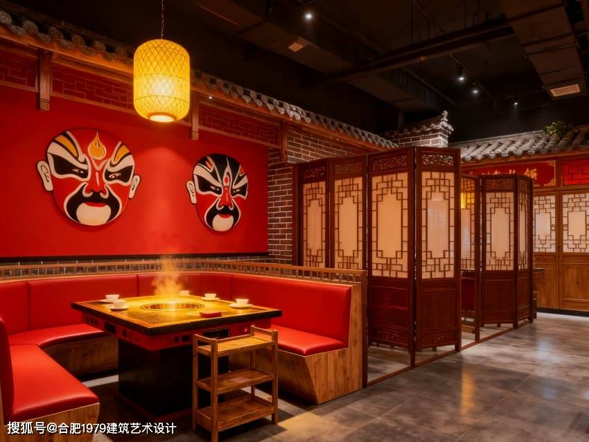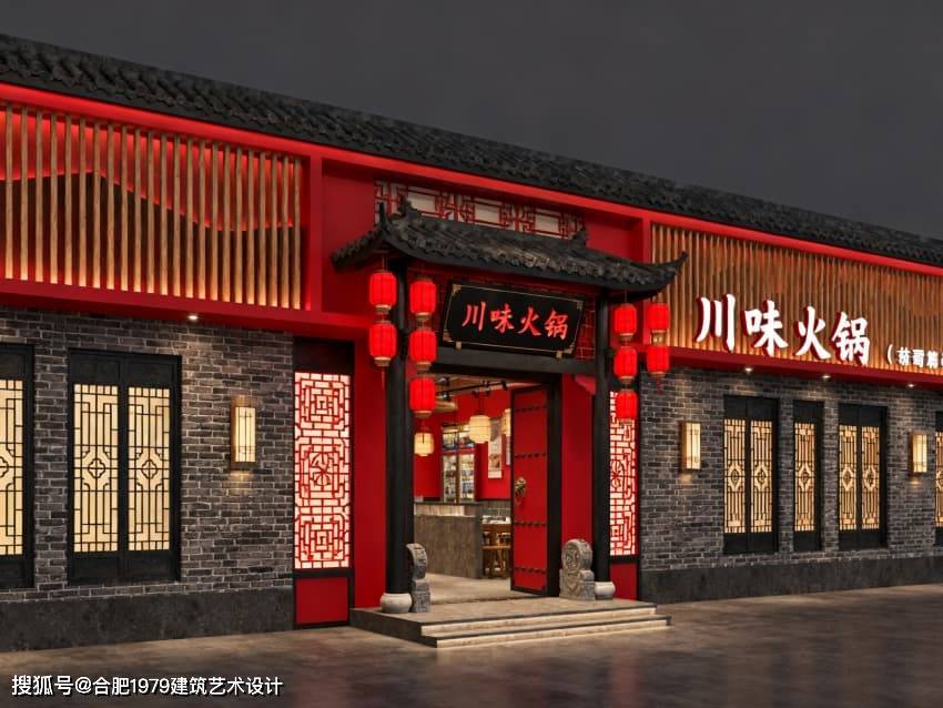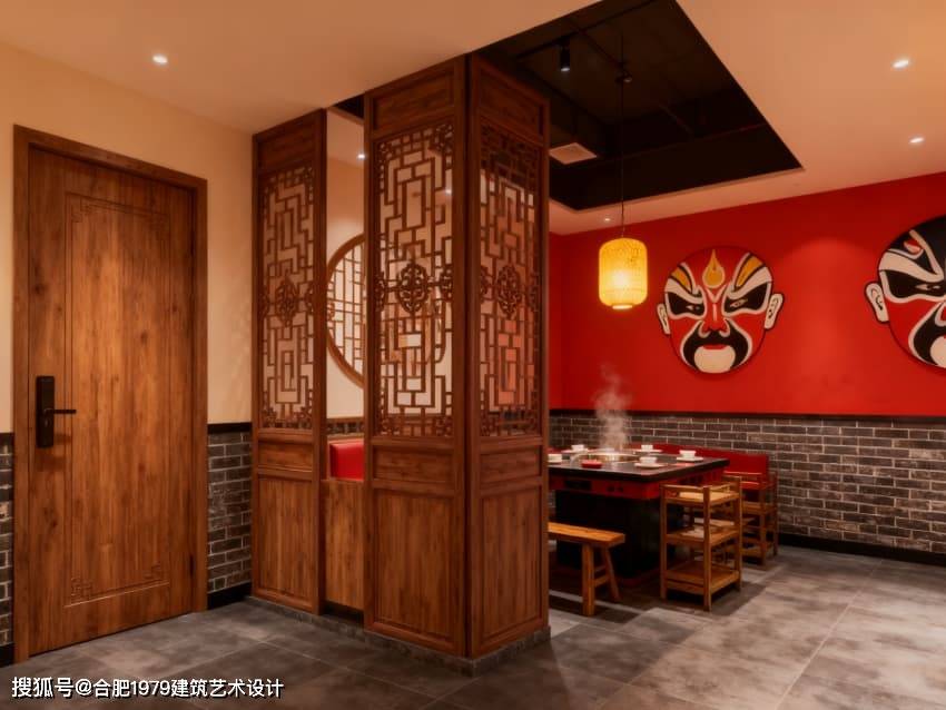本1200㎡川味火锅店主打“新派川韵·烟火共生”设计理念,实现外立面与内部空间风格统一,既延续川渝传统烟火气,又融入现代舒适体验。外立面以红棕为主色调,搭配青灰色仿砖肌理与木质格栅,嵌入复古灯笼与川剧脸谱元素,直观传递川味内核,门头开放式设计增强通透感,吸引食客驻足。