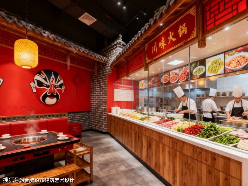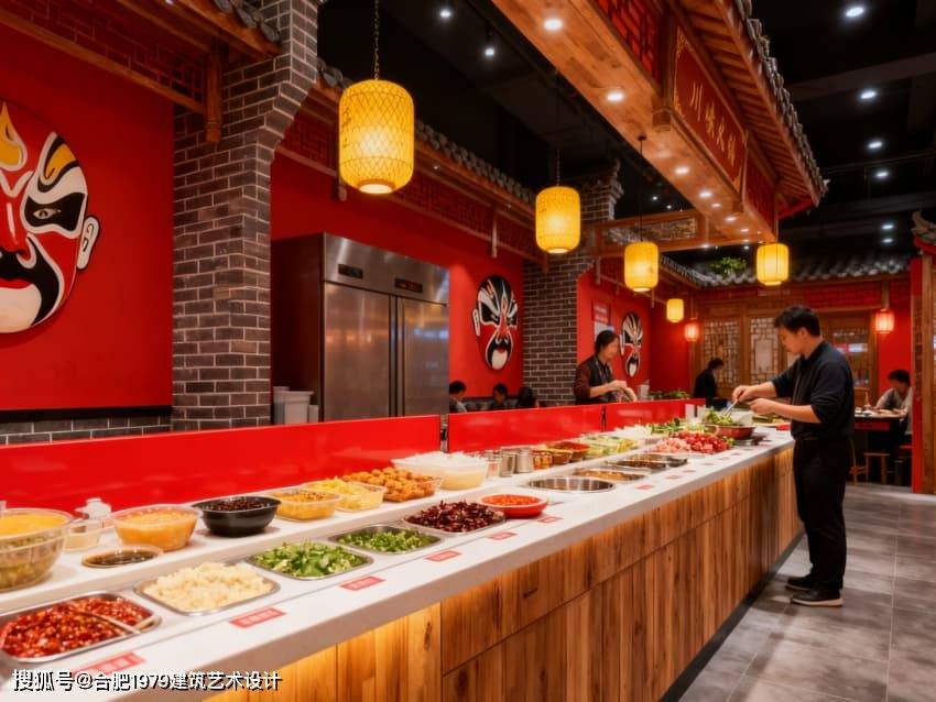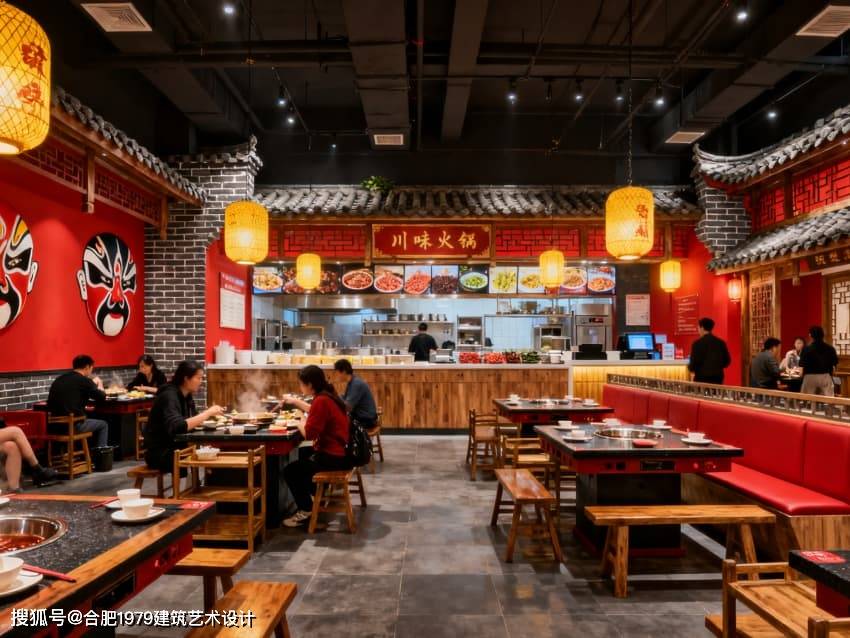 整体以红、棕、青灰为主色调,呼应川渝市井风情与火锅热辣特质。材质上选用耐磨防滑的仿古砖、温润的实木桌椅,墙面点缀手绘川渝街巷壁画与辣椒、花椒等元素装饰。灯光设计兼顾实用与氛围,餐台吊灯聚焦用餐区域,吊顶隐藏式灯带营造暖调氛围。1200㎡空间动线流畅,各区域衔接自然,既还原川渝火锅的烟火气息,又通过现代设计手法提升用餐舒适度,实现传统风味与当代审美的平衡。
