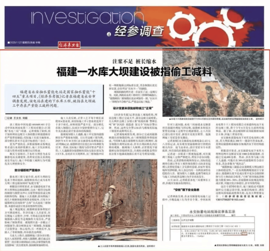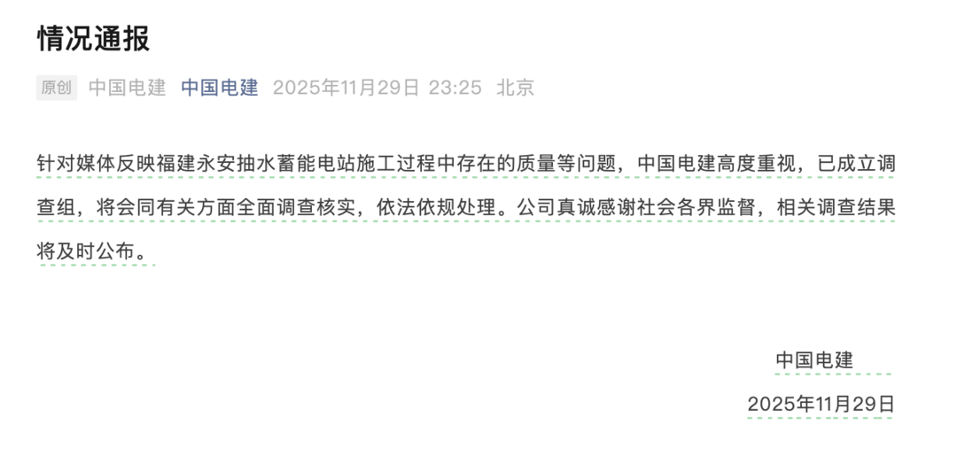 11月29日深夜,中国电力建设集团发布情况通报称,针对媒体反映福建永安抽水蓄能电站施工过程中存在的质量等问题,中国电建高度重视,已成立调查组,将会同有关方面全面调查核实,依法依规处理。