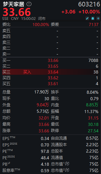 截至2025年12月2日,梦天家居收盘价为33.66元/股,最新市盈率为122.36倍,公司所处行业最新市盈率为17.58倍,公司相关指标严重偏离行业合理估值水平。