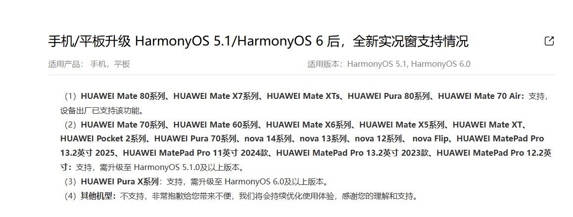 此次公布的名单中,部分机型出厂即可支持,全新旗舰机型已经全系覆盖;而另一批设备只需升级到HarmonyOS 5.1/HarmonyOS 6,即可获得对应支持。华为也明确表示,部分老机型仍暂不支持全新实况窗。