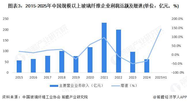 从行业内主要上市公司玻璃纤维业务收入总规模看,2022年和2023年持续下降,2024年主要上市公司玻璃纤维业务收入总规模为363亿元,较2023年提升3.25%。2025年上半年,主要上市公司玻璃纤维营收合计为196亿元。