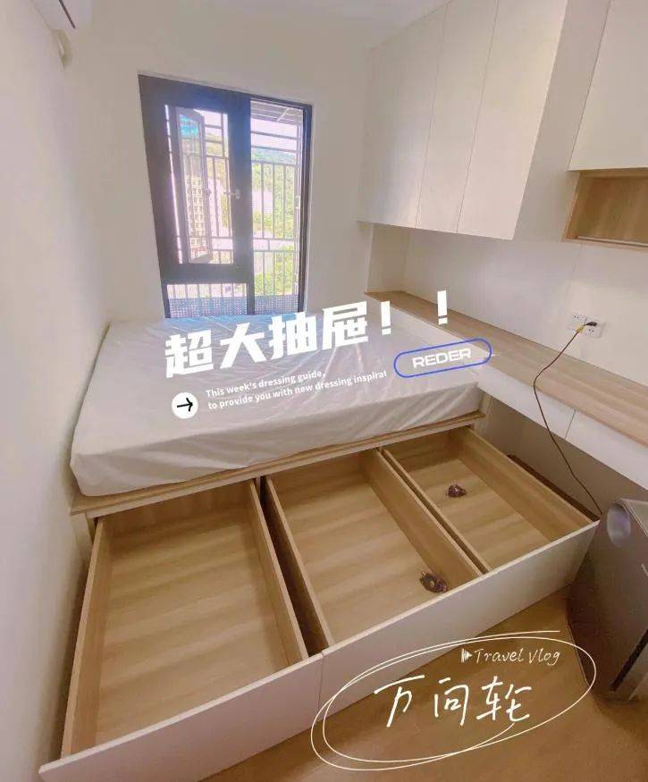 1)侧面抽屉:放弃箱体收纳,只做侧面“深抽收纳”,以此提升收纳便捷性。需要注意的是,房间得满足深抽拉出来的空间,以及抽屉底部需要安装万向轮提升支撑力和灵活性。