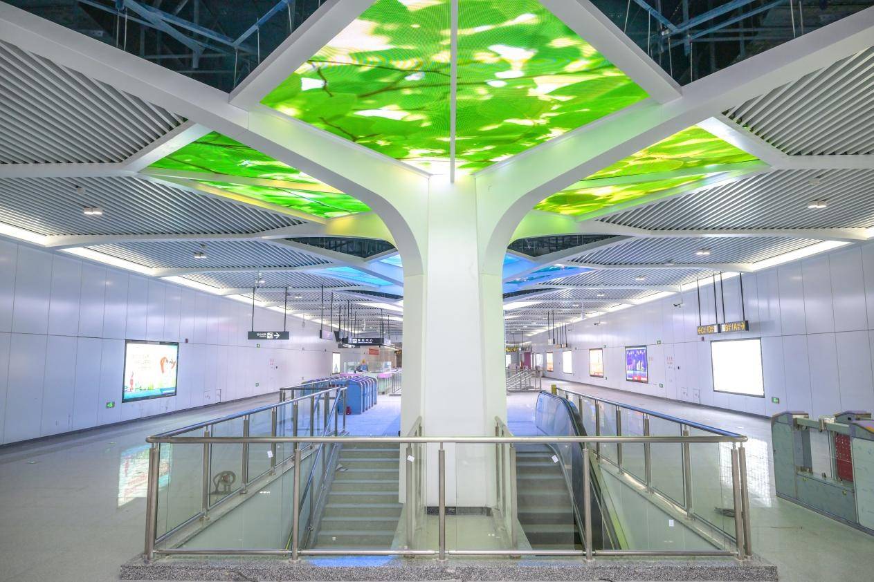 其中,开福寺站是新建第一站,位于望江西路与玉兰大道路交叉口。本站为明挖地下二层岛式站台车站,主体建筑面积为20804.2平方米,附属建筑面积为5895.8平方米,总建筑面积为26700平方米,是全线四大装饰特色站之一,主题为生命之树。车站设计灵感源于站点西北侧绿意盎然的大蜀山国家森林公园,提炼大蜀山苍松翠柏的挺拔之姿、奇花异草的鲜活肌理,站厅顶面以渐变绿为主色调,模拟山林层叠起伏,吊顶用简约线条勾勒,形似枝叶舒展蔓延,是合肥首次通过柔性LED屏、软膜灯,展现“科技树”与“生态树”的动态美感。