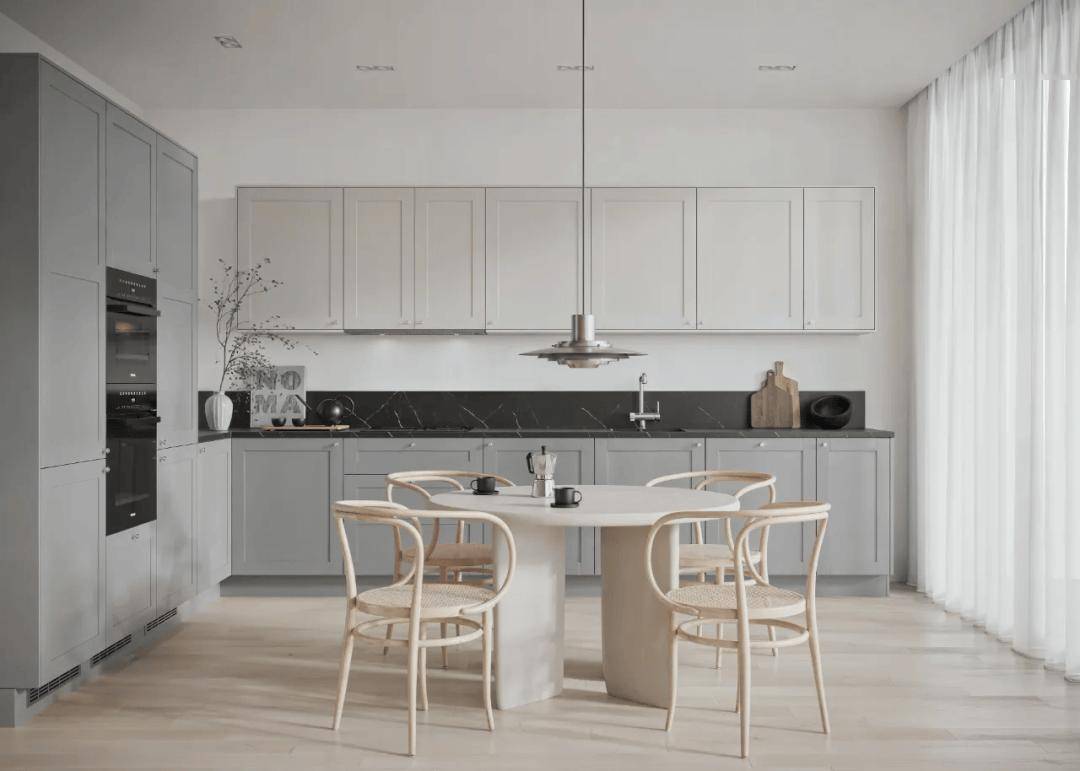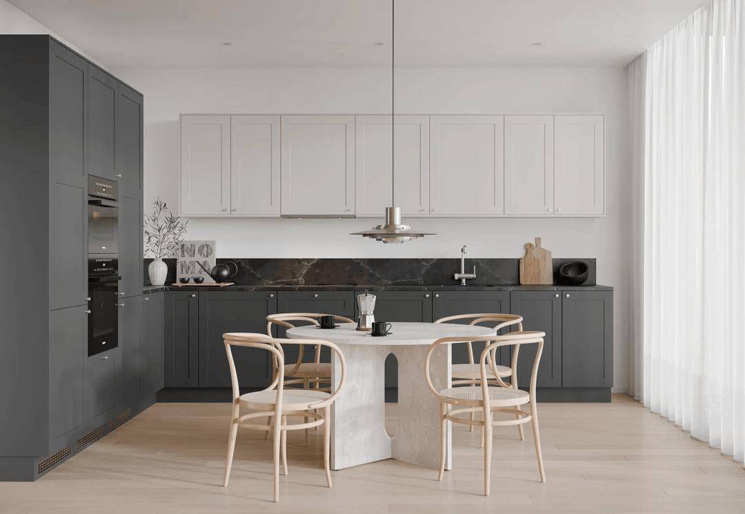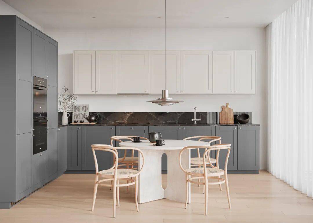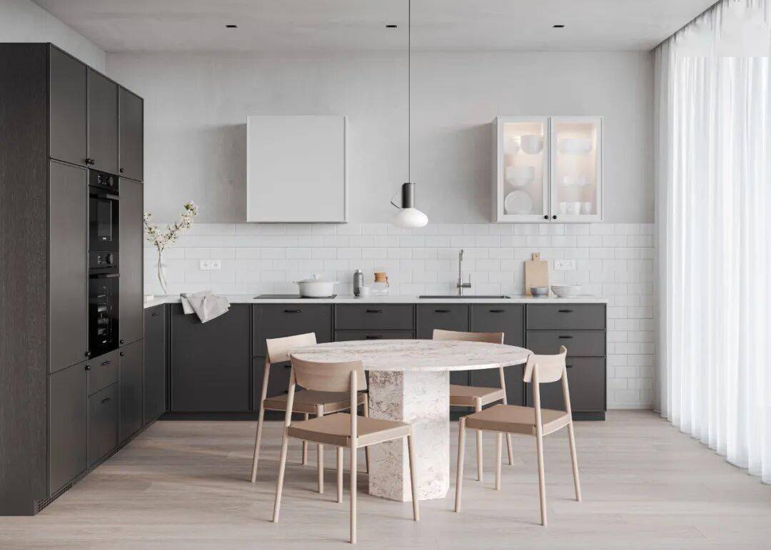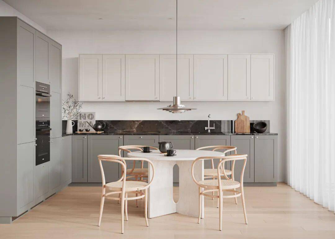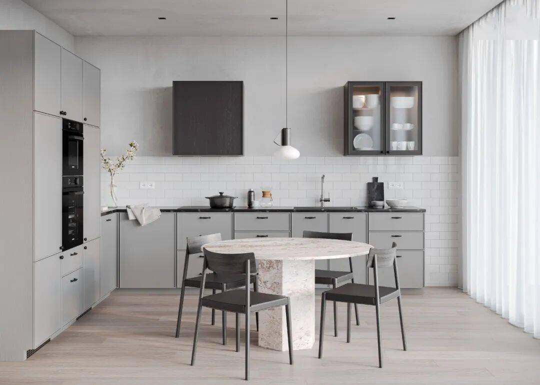 喜欢简约高级?可以选 “灰白撞色款”,浅灰柜体配白色吊柜,搭大理石餐桌,清冷又精致;或是 “奶白极简款”,通体浅白 + 细条瓷砖,温柔感拉满。